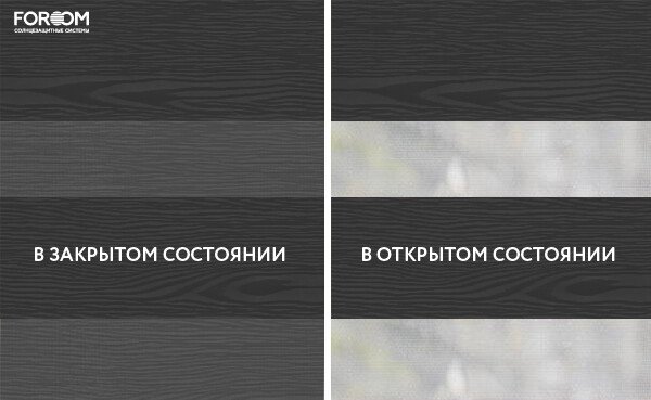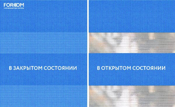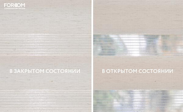 Каждый слой ткани имеет чередующиеся непрозрачные и прозрачные полосы. При смещении полос друг относительно друга можно добиться полного затемнения («ночь», когда непрозрачные полосы совпадают), максимального светопропускания («день», когда совпадают прозрачные полосы) или промежуточных режимов, создавая эффект «зебра».